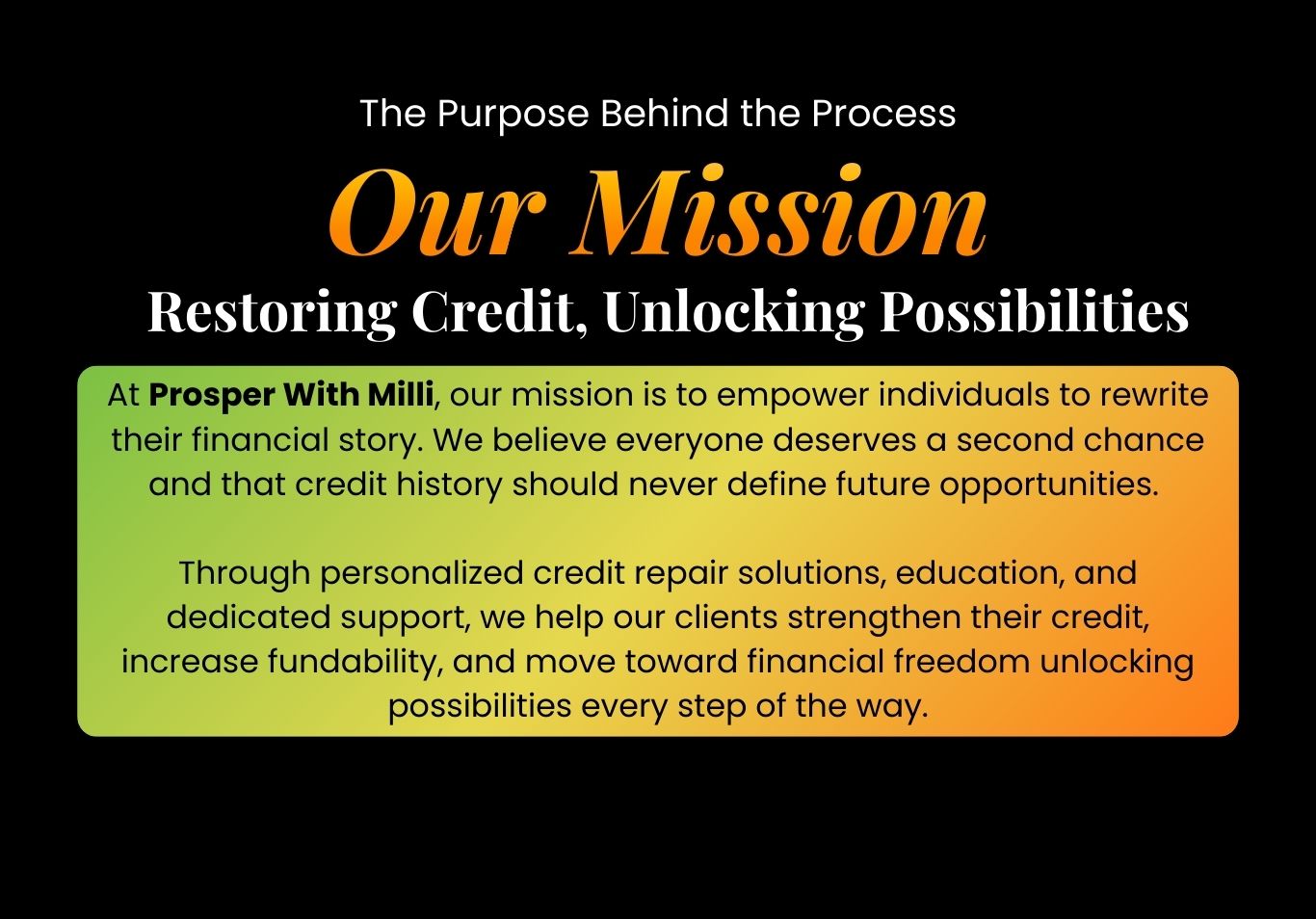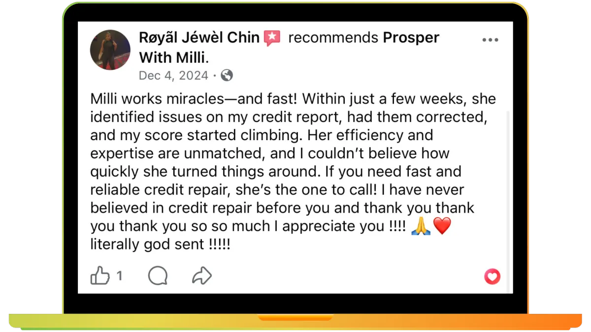 At Prosper With Milli, our mission is simple: to change the narrative around credit repair and financial empowerment. We believe everyone deserves a second chance, and no one should be permanently limited by their credit history. Credit is a tool, not a life sentence.